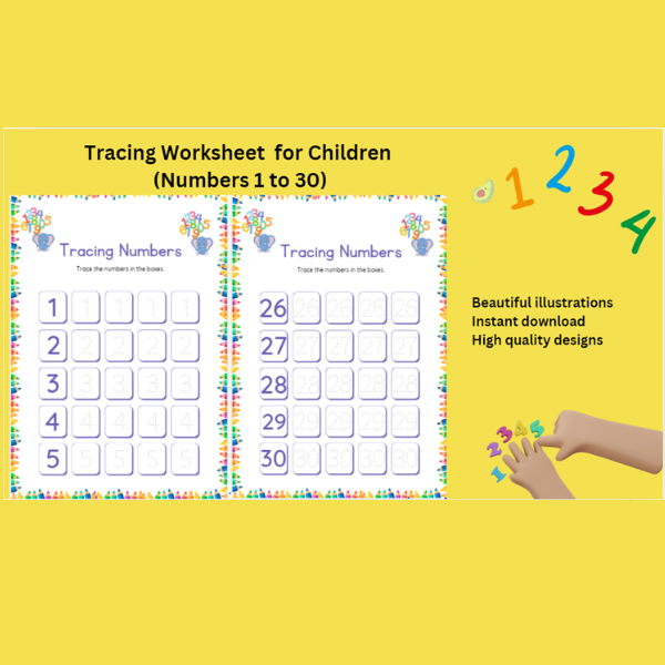Tracing Worksheet for Children Numbers 1 to 30 Printable Instant Download